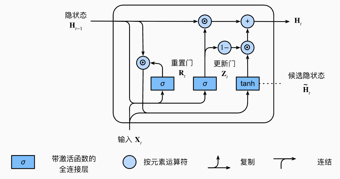 :决定当前隐状态 有多少来自之前的 ,有多少来自新的候选状态 。 - 重置门(Reset Gate)