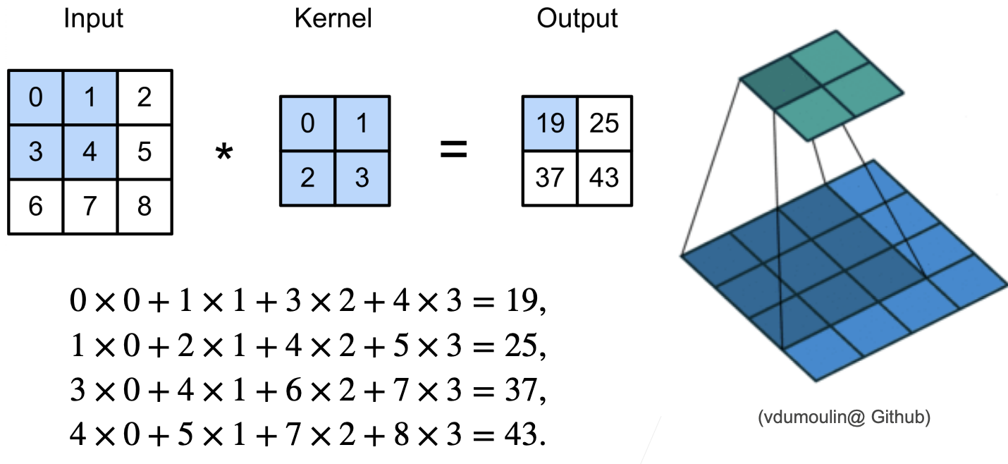 - 定义:将输入和核矩阵进行交叉相乘,加上偏移后得到输出。