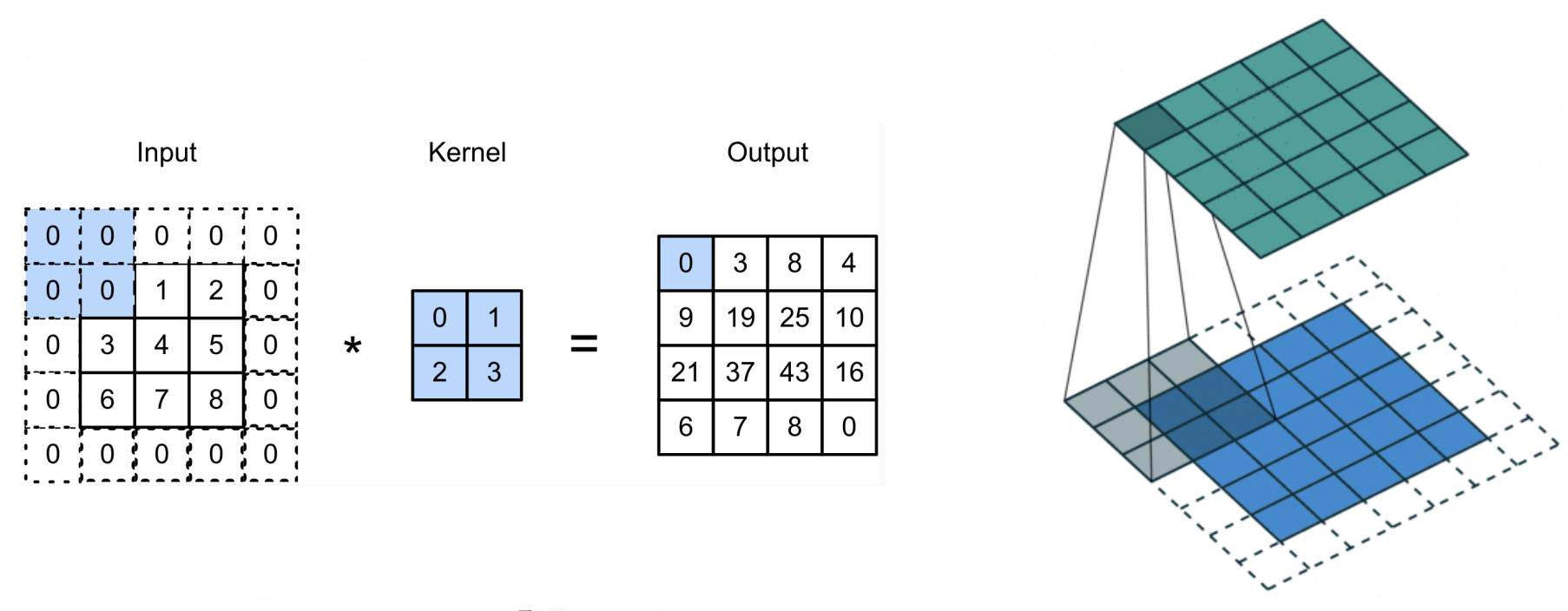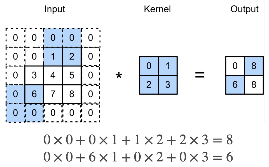 - 填充通过在输入四周补零,减缓输出形状的缩减。