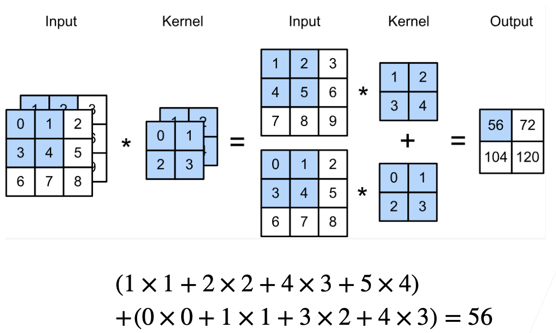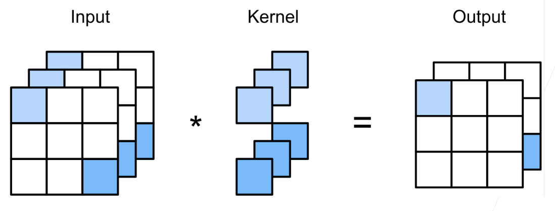 - 每个输入通道有独立的卷积核,卷积结果相加后再送给每个输出通道。