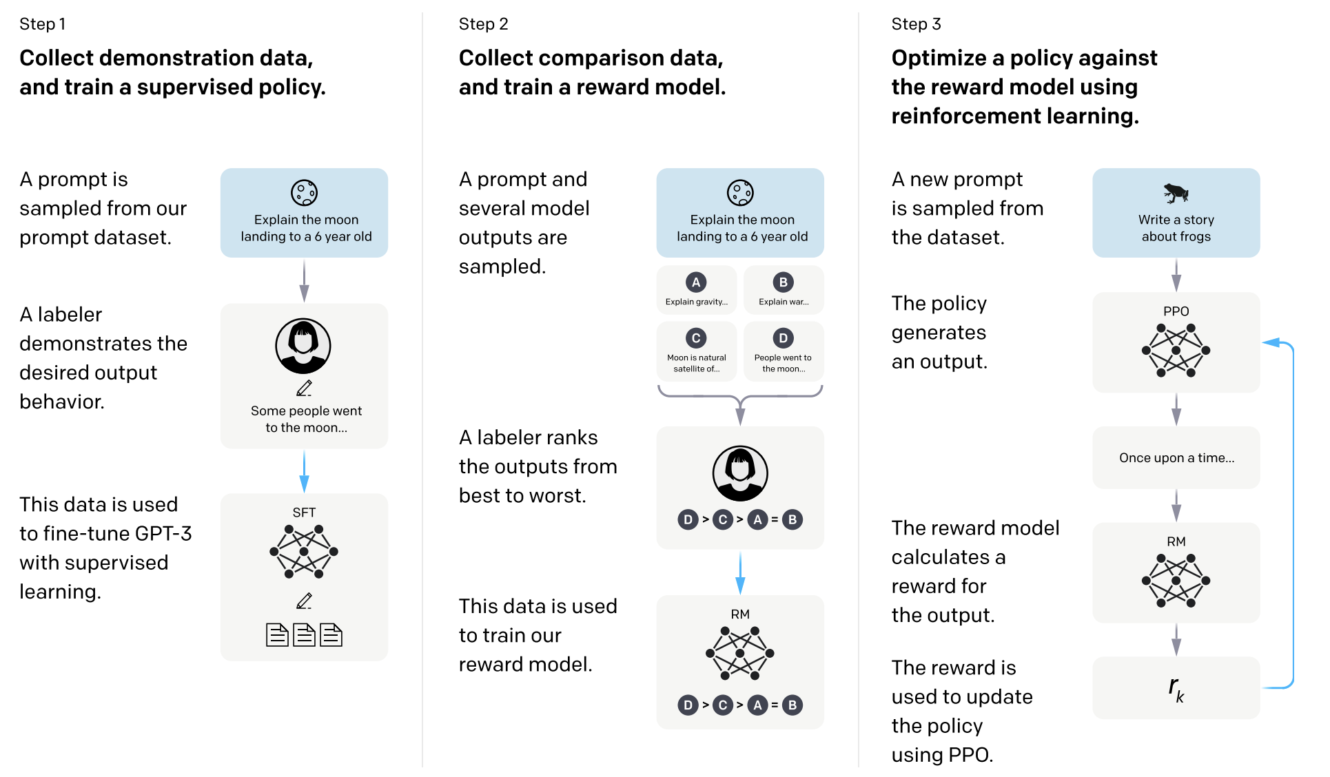 核心方法:使用来自人类反馈的强化学习对GPT-3进行微调,让其遵循更广泛的书面指令。