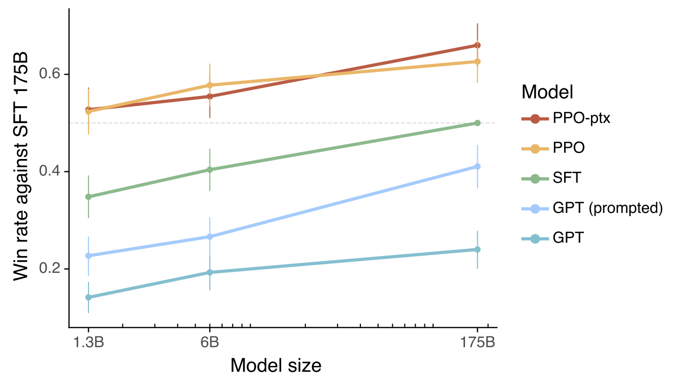加入人类反馈微调(SFT)后,模型表现大幅跃升,远超同规模纯GPT-3;