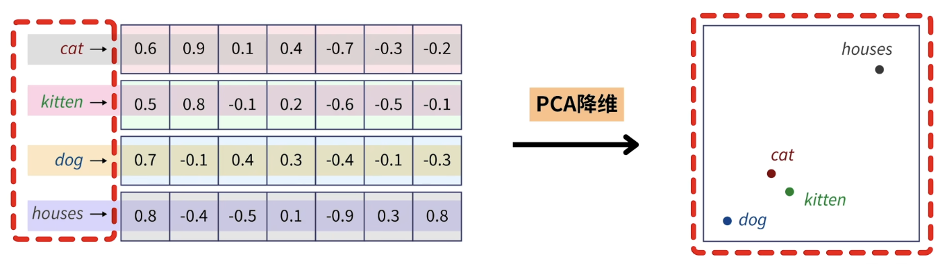 语义相似:如果用PCA把词向量降到二维再画出来,语义接近的词会聚在一起。