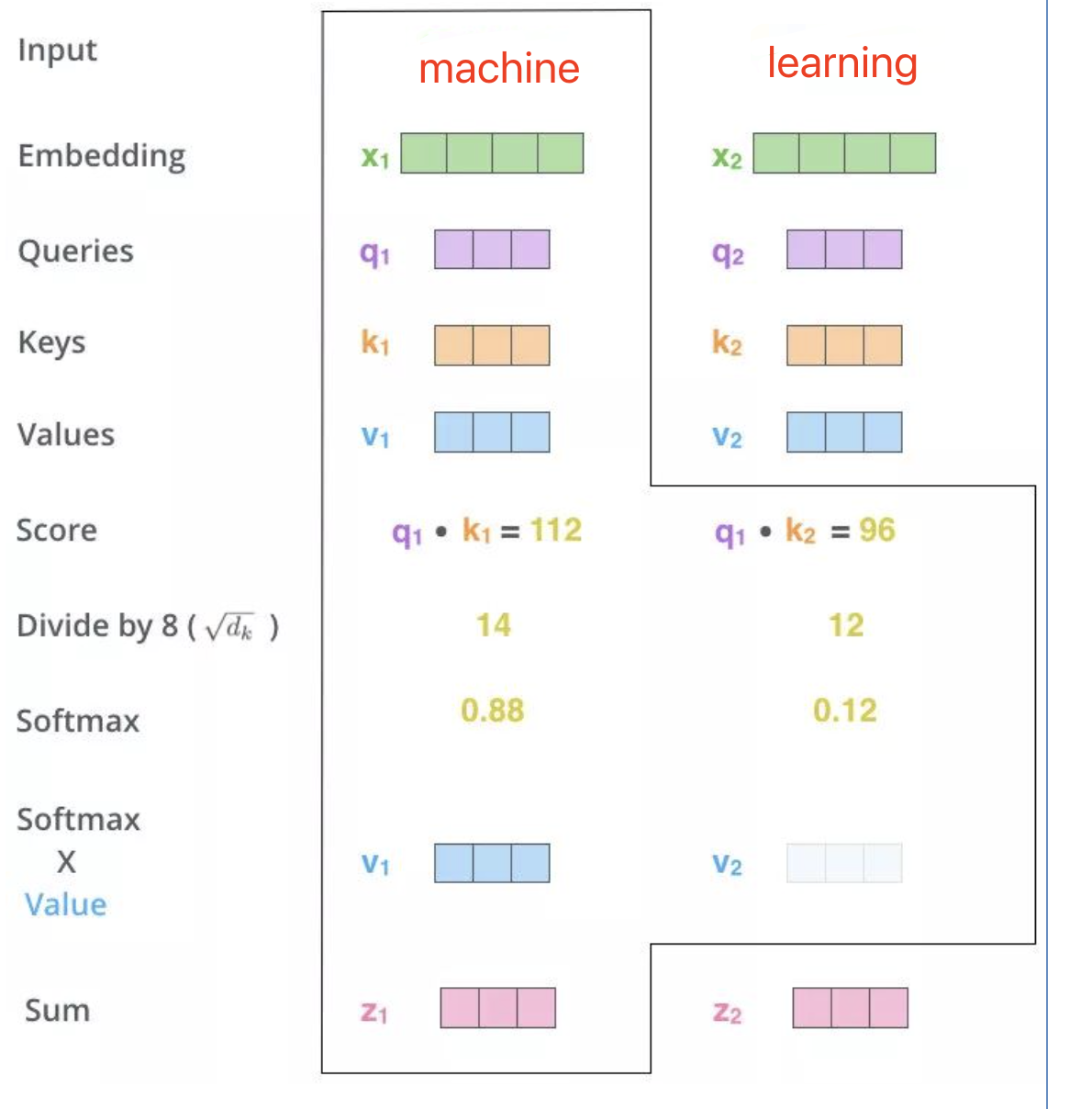 - 让每个词对输入序列中所有词做自注意力,获得融合全局信息的新词向量(包括位置、语法、语义特征)。