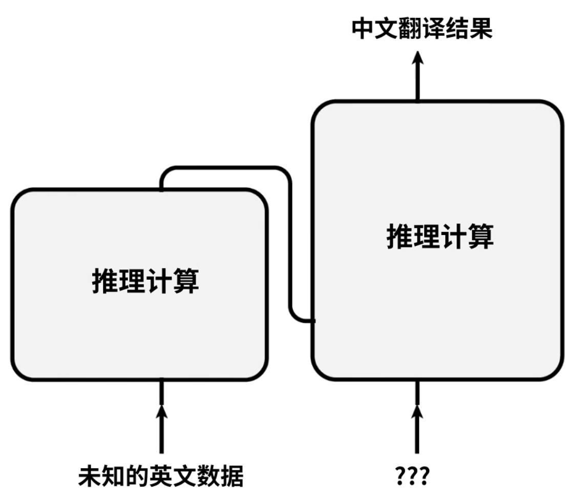 - 第一次推理计算:Encoder会得到英文,Decoder是未知的位置,会有一个