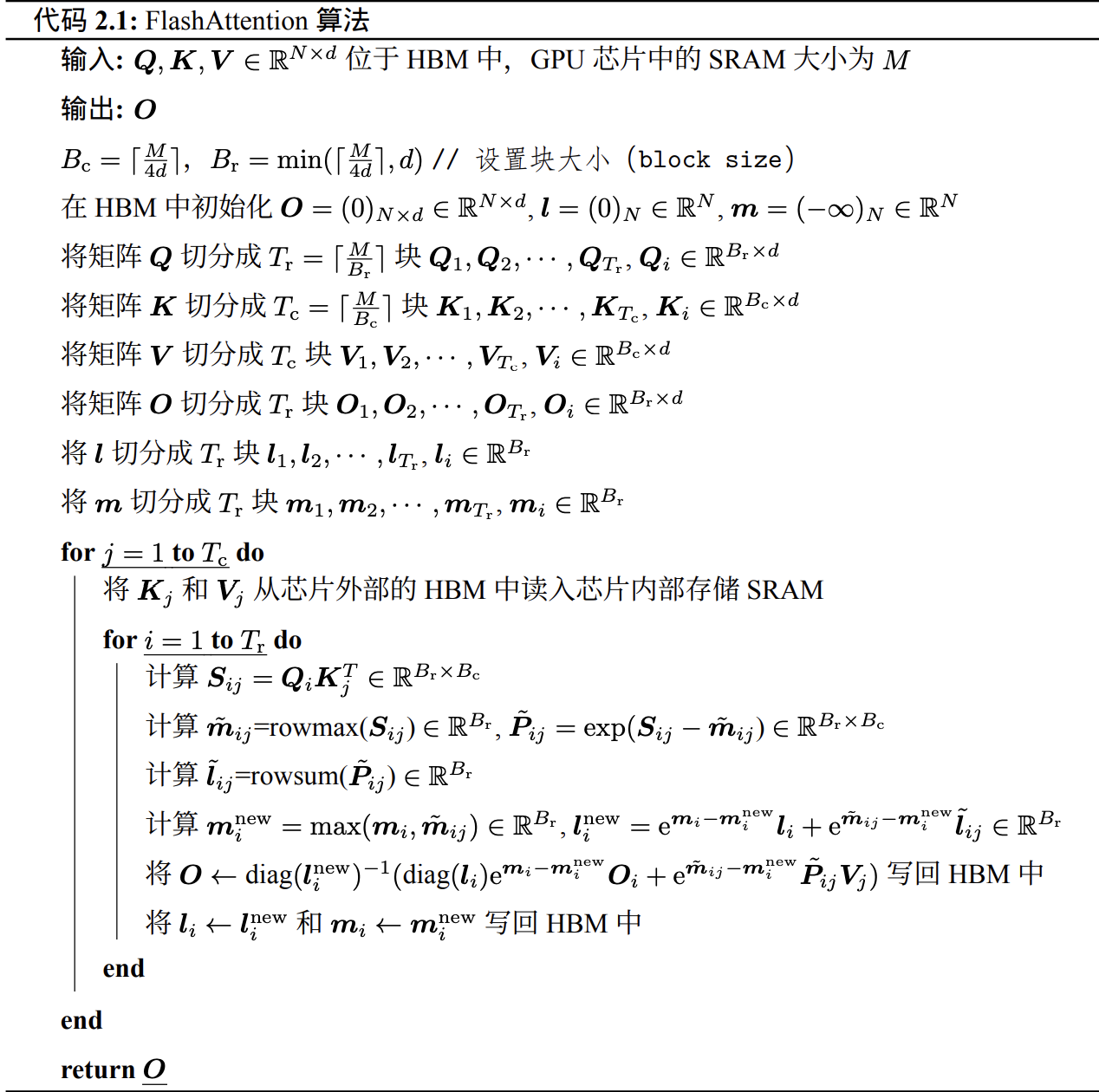 , 等大中间矩阵写入全局内存,大小与序列长度平方成正比,带来巨大的内存带宽消耗。 - FlashAttention 通过分块传输与块内归一化/Softmax,避免全矩阵读写,仅小块数据在片内 SRAM 与全局 HBM 间流转。