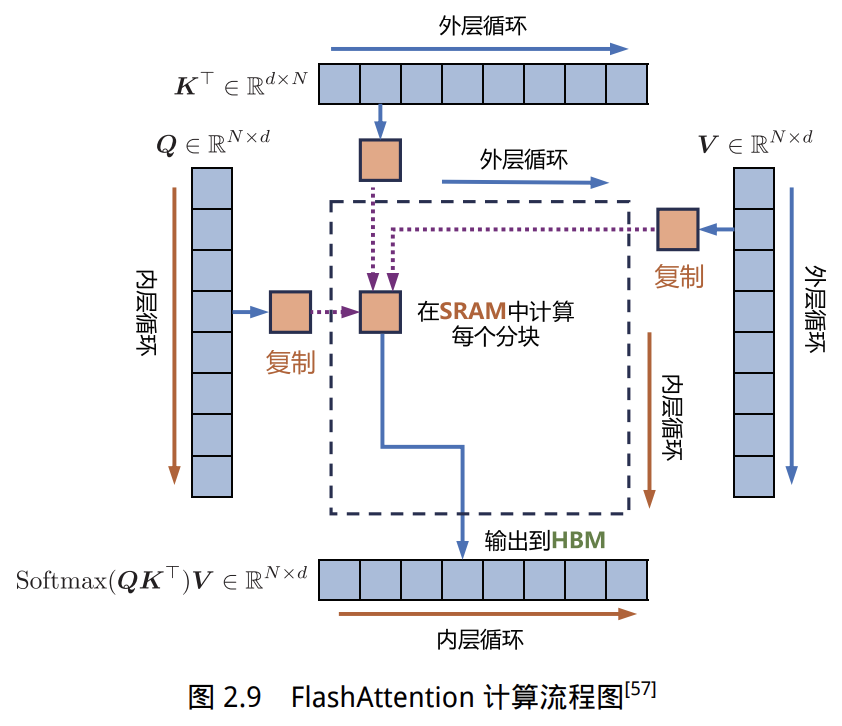 做矩阵乘法前,先完成 、 每个分块中一整行的计算。 - FlashAttention 中,将输入分割成块,在每个块内执行多次传递,以分步方式完成 Softmax 计算与