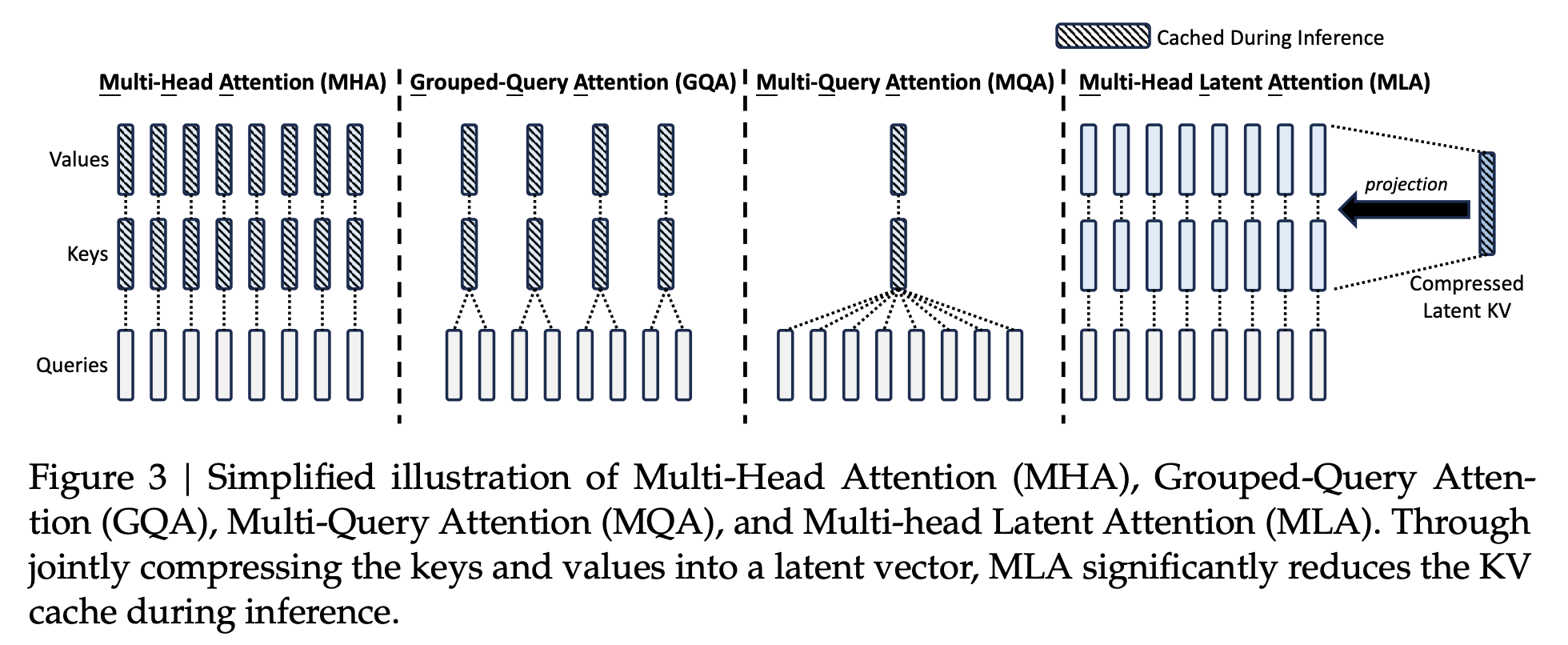 - MLA:将所有的 K/V 用线性变换映射到低维 latent space,推理时只需缓存这个 latent 向量