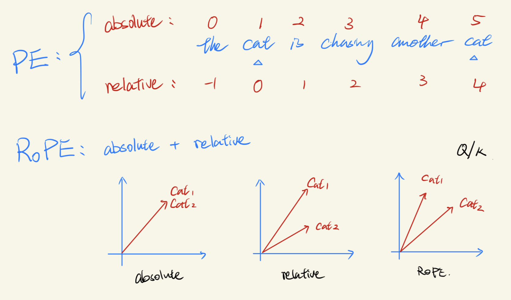 - Absolute PE:同一个词(如 “cat”)在不同位置的向量具有相同的方向,但长度不同。