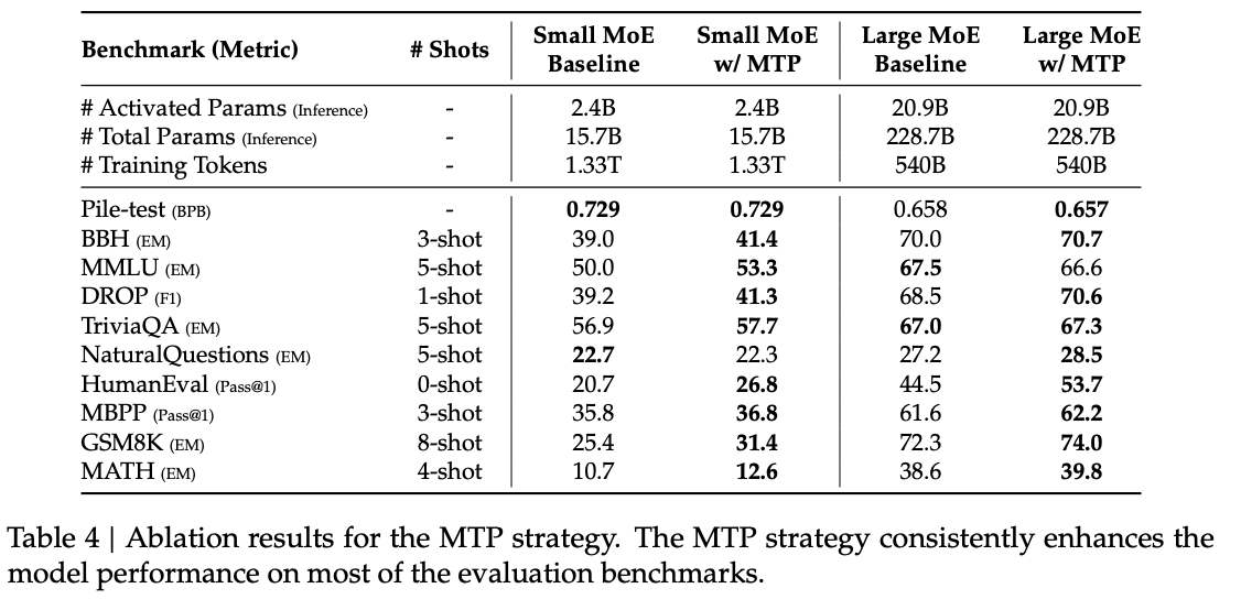 表4展示了 MTP 策略在两个不同规模基线模型上的消融实验:小模型(157亿参数,1.33万亿token)、大模型(2287亿参数,5400亿token)。结构和数据一致,仅加入深度为1的MTP模块。推理时MTP模块被舍弃,推理成本不变。结果显示,MTP 能在大多数基准上持续提升模型表现。