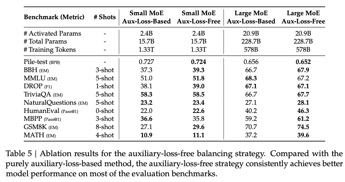 表5展示了无辅助损失负载均衡策略在同两组基线模型上的对比。与仅用辅助损失的基线(sigmoid门控+top-K归一化,超参数同DeepSeek-V2-Lite/V2)相比,移除辅助损失,改为无辅助损失策略后,多数评测基准表现更优。