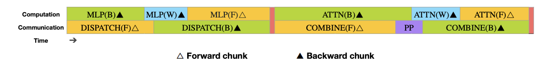 图 4 | 前向和反向块的重叠策略(transformer 块的边界未对齐)。橙色为前向,绿色为输入反向,蓝色为权重反向,紫色为流水线通信,红色为同步屏障。所有 all-to-all 和流水线通信都能完全隐藏,实现高效计算与通信重叠。