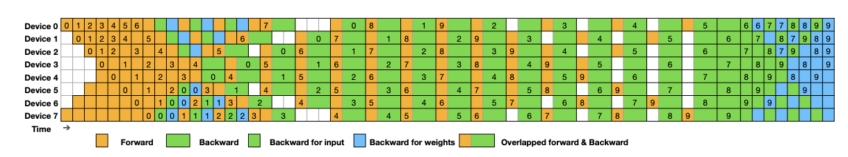 表示前向块执行时间, 表示完整反向块执行时间, 表示“权重反向”块执行时间, 表示前向与反向块重叠时的执行时间。