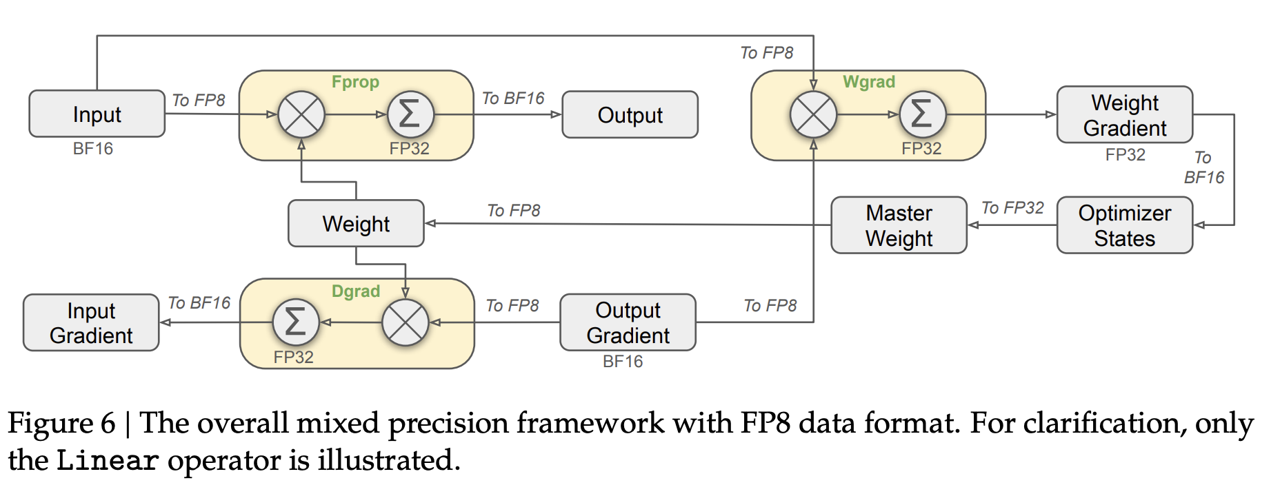 我们提出了一种用于 FP8 训练的混合精度框架,大部分计算密集操作采用 FP8 精度,部分关键操作保留高精度,以兼顾效率与数值稳定性(见图 6)。