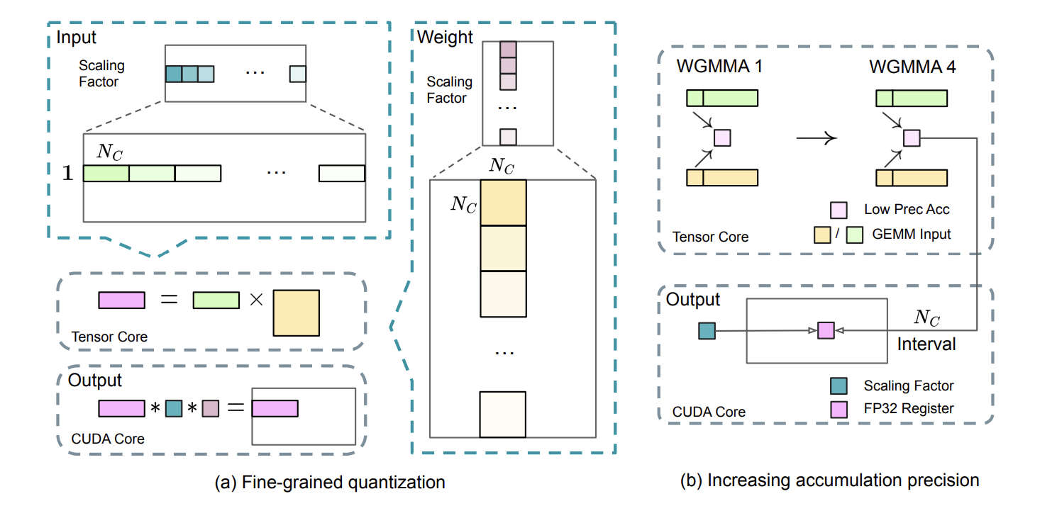 此外,在 GEMM 内维引入每组独立缩放因子,结合 FP32 累加方案,高效支持这一细粒度量化。这种方法与 Blackwell 架构 GPU 的微缩放格式高度一致,为适配新一代显卡提供了实践参考。